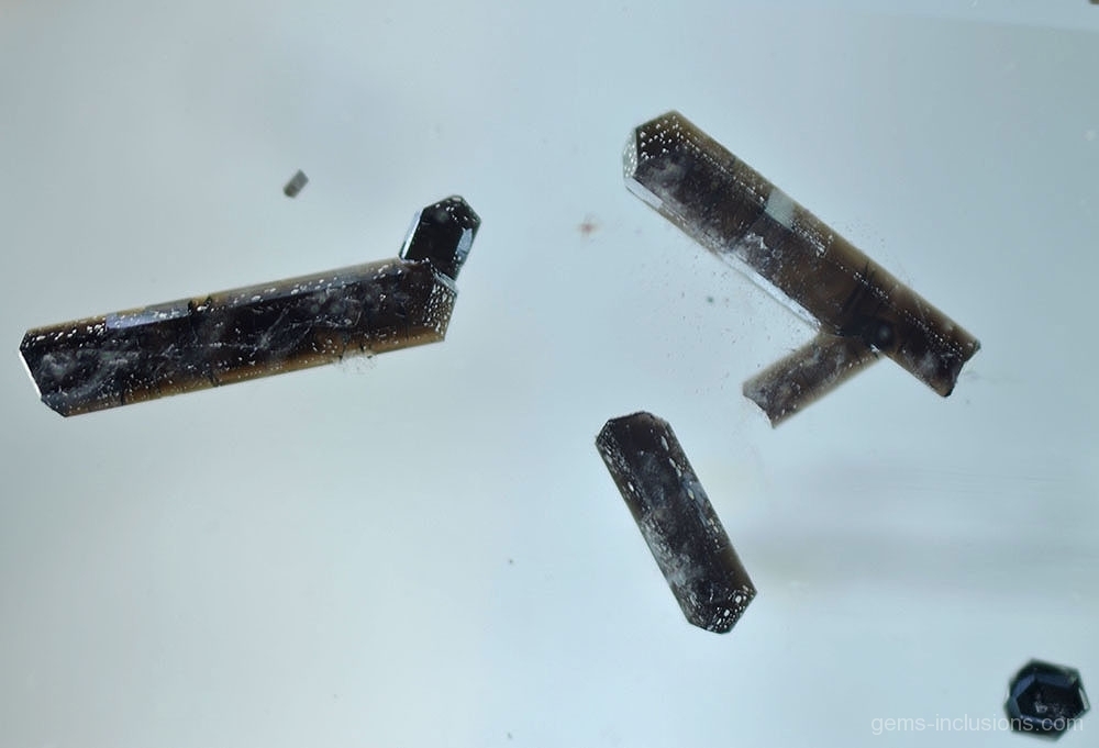 Dark brown dravite inclusions in aquamarine