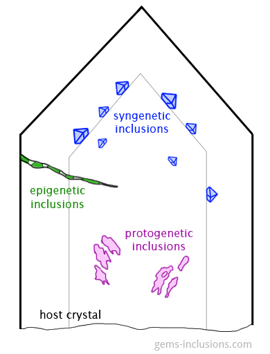 By time of entrapment, solid inclusions are divided into three categories: those formed before the host crystal, called protogenetic; those that form together with the growing crystal, during its formation, called syngenetic; and finally those formed after the host crystal had finished its growth, crystallizing in fissures and as alteration products of previously formed inclusions, called epigenetic. The figure below is a schematic representation of these three types of inclusions. They are considered more in depth in further sections.