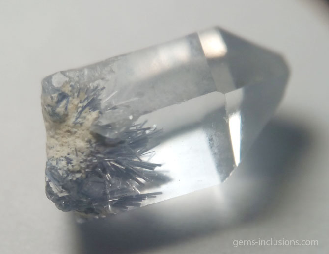 Group of blue dumortierite needles covering the base of clean colorless quarz crystal.