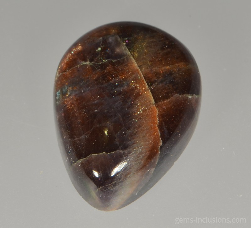 Iolite with aventurescence due to numerous plate-like inclusions of hematite. This kind of iolite is also frecuently marketed as “bloodshot” iolite, when platelets are reddish in color.